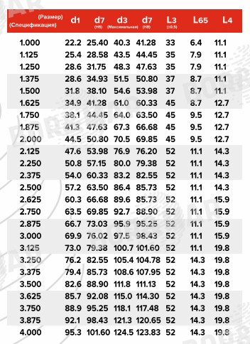 | Размер, спецификация | d1, мм | d7, мм | d3, мм | d7, мм | L3, мм | L65, мм | L4, мм |